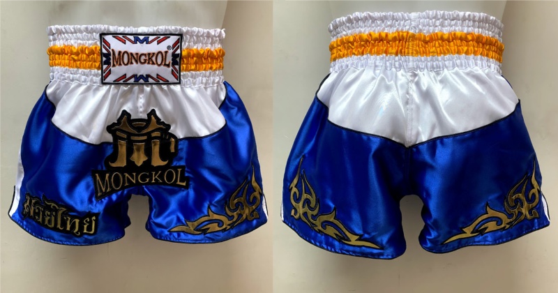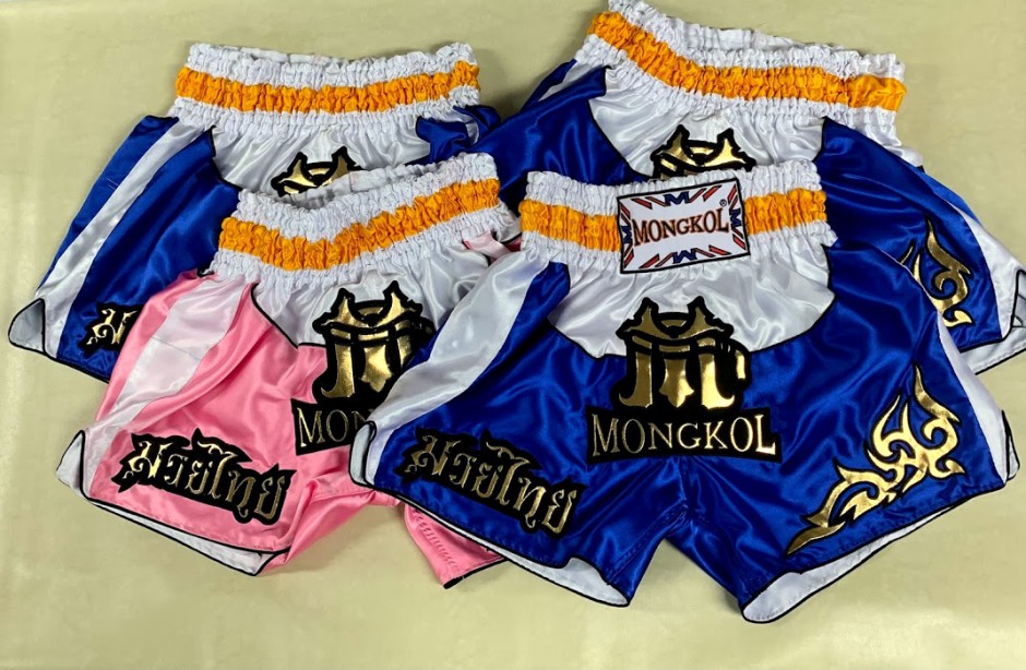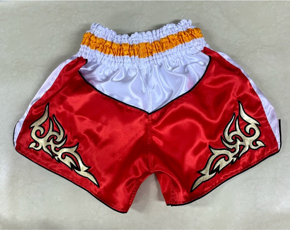 กางเกงมวยไทย (Muay Thai Shorts): เน้นความวิจิตร ลายเส้นต้องอ่อนช้อยแต่ดูแข็งแกร่ง มักปักลงบนผ้าต่วน (Satin) หรือผ้าไมโครที่มีความเงา